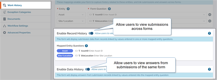 2. Go to SettingsWork History. In the Map Entities to Form Questions section: