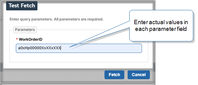 Select Test Fetch, enter actual values for all query parameters, and then select Fetch.