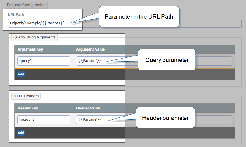 In the Request Configuration section, define your parameters. You can include them as part of the URL Path, as a query-string Argument Value, or as a Header Value.